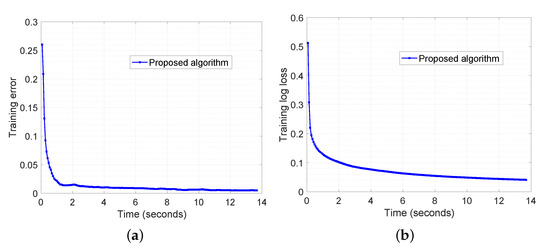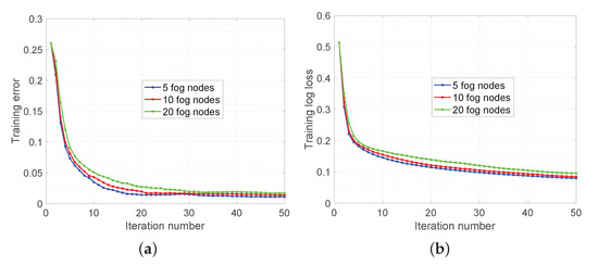 We studied the spam email classification problem in a fog-computing environment. The Enron dataset was used to train logistic regression models to classify email as spam or ham. The dataset contains data from about 150 people from senior management of Enron, organized into folders [64]. In total, 5000 emails from Enron Folder 1 were used for training. Among them, are spam and are ham emails. We pre-processed the emails and kept only frequent words. The dimension for the features is 7997 determined by counting the frequent words. The training error (fraction that the training model is wrong in classification) and training log loss (value of the loss function) were used to measure the learning process. Fog nodes were considered to form a mesh network such that there is a direct link between any pair of fog nodes. The learning rate and the momentum parameter were fixed to and , respectively.