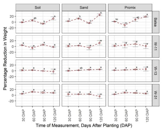 Comparison of the percentage change in material weight in three growing media (Promix, sand, and soil) at four growth stages (30, 60, 90, and 120 days after transplanting (DAP)). Different lowercase letters indicate significant differences in % weight change between different growth stages, at α = 0.05, within each growing media and material, whereas the same letters indicate no significant difference across compared treatments. W-11, 1:1 blend of beeswax and soy wax; W-13, 1:3 blend of beeswax and soy wax; and W-31, 3:1 blend of beeswax and soy wax.