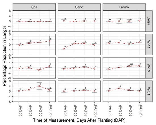 Comparison of percentage change in material length in three growing media (Promix, sand, and soil) at four growth stages (30, 60, 90, and 120 days after transplanting (DAP)). Different lowercase letters indicate significant differences in % length change between different growth stages, at α = 0.05, within each growing media and material, whereas same letters indicate no significant difference across compared treatments. W-11, 1:1 blend of beeswax and soy wax; W-13, 1:3 blend of beeswax and soy wax; and W-31, 3:1 blend of beeswax and soy wax.