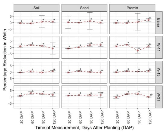 Comparison of percentage change in material width in three growing media (Promix, sand, and soil) at four growth stages (30, 60, 90, and 120 days after transplanting (DAP)). Different lowercase letters indicate significant differences in % width change between different growth stages, at α = 0.05, within each growing media and material, whereas same letters indicate no significant difference across compared treatments. W-11, 1:1 blend of beeswax and soy wax; W-13, 1:3 blend of beeswax and soy wax; and W-31, 3:1 blend of beeswax and soy wax.