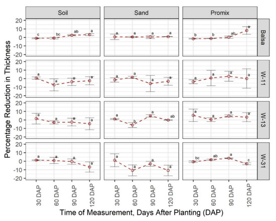 Comparison of percentage change in material thickness in three growing media (Promix, sand, and soil) at four growth stages (30, 60, 90, and 120 days after transplanting (DAP)). Different lowercase letters indicate significant differences in % thickness change between different growth stages, at α = 0.05, within each growing media and material, whereas same letters indicate no significant difference across compared treatments. W-11, 1:1 blend of beeswax and soy wax; W-13, 1:3 blend of beeswax and soy wax; and W-31, 3:1 blend of beeswax and soy wax.