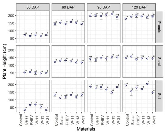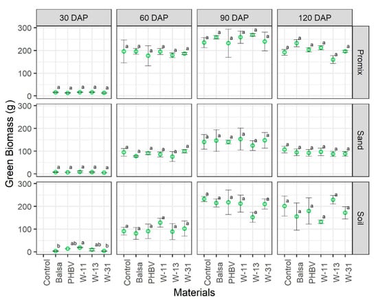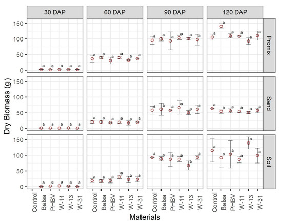 At each growth stage (30, 60, 90, and 120 DAP), for each growing media, plant attributes (plant height, green biomass, and dry biomass) were analyzed using ANOVA to detect significant differences between control plants and plants from material treatments (α = 0.05). One-factor ANOVA model with materials as the independent factor was used to model every plant attribute as shown in Equation (1).