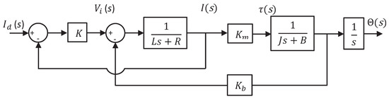 Motors are widely used in industrial applications and control systems. Thus, it is necessary to obtain a model that allows for a correct analysis. The dynamic model of this servo system depends on the electrical and mechanical characteristics, as resistance R, inductance L, and inertia J of armature, the counter-electromotive force , and the friction B [25]. Figure 1 shows the block diagram of the DC motor model with a proportional current loop. Where K is a proportional gain of current loop, and I are the voltage and current applied to the armature, is the torque generated in the shaft of the motor, and are the position and angular velocity of the shaft, and and are the constants of the counter-electromotive force and the torque, respectively. The electrical relationship is , while and mechanical relationship is given as .