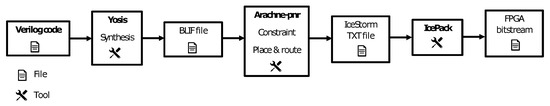 The structure of the IceStorm project is depicted with a flow chart in Figure 4. In [9], it is observed that IceStorm is an open-source project that is integrated by different tools: (1) Yosys is a synthesis tool similar to the one used by the manufacturer that converts Verilog code to a different format, such as FLIG, EDIF, BTOR, SMT-LIB, and RTL with Verilog 2005 stand. Moreover, (2) Arachne-PNR is a tool that implements the hardware build process place and route using BLIF files and generates the IceStorm TXT file. Arachne-PNR is currently unsupported and the NextPNR tool became a full functional replacement with significant enhancements. Finally, (3) IcePack converts TXT file into bitstream [9,34].