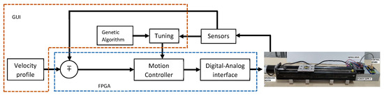 The GUI developed in Python executes the calculations for the trapezoidal velocity profile. This interface is responsible for modifying the discrete PID controller gains and sending these values , , , and via the serial port to the FPGA. The GA is executed in the GUI as well. In addition, the GUI is responsible for receiving the information from the FPGA, the values of the X axis of the sensor, the current position of the motor, the error, and the control signal. These variables are plotted to observe the behavior and performance of both the controller and translational mechatronics system. The data can be stored by date at each start-up of the system. Figure 8 shows the proposed control and self-tuning scheme. The Algorithm 1 presents the steps for the implementation of the GA.