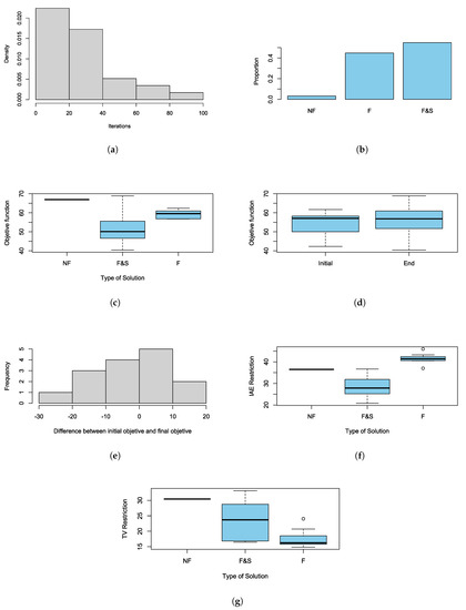 Statistical analysis of the proposed GA (a) distribution of the number iterations, (b) analysis of not feasible (NF), feasible (F) and feasible and suitable solution (F&S), (c) estimated standard deviation of the objective reached, (d) obtained values of the objective function, (e) change of the objective function, (f) change of the Integral Absolute Error (IAE) restriction, and (g) change of the TV restriction.