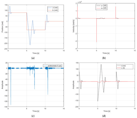 Response of test bench with a step input applied without GA applied. (a) Angular position and reference. (b) Angular and desired velocity. (c) Accelerometer X axis. (d) Error and control signal.