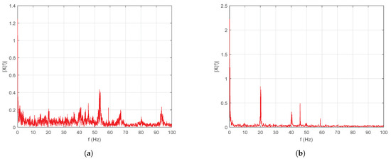 Figure 13a,b show the frequency analysis via the FFT algorithm output when step inputs and trapezoidal velocity profile were applied, respectively. When the system presents step inputs, the vibrations of the system increase, which may cause failures in the future.