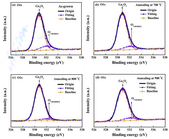 X-ray photoelectron spectroscopy (XPS) spectra of O1s core level spectra of (a) as-grown Ga2O3 films and Ga2O3 films annealed at (b) 700 °C, (c) 800 °C, and (d) 900 °C.