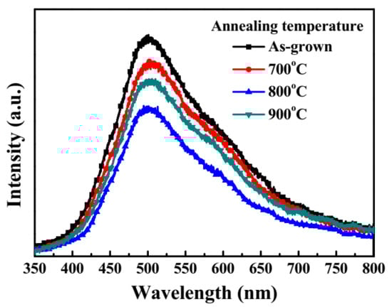 Figure 4 shows the room-temperature PL spectra of the as-grown Ga2O3 films and the annealing-treated Ga2O3 films excited by a He-Cd laser with a wavelength of 325 nm. For all the Ga2O3 films, the broad band caused by the oxygen vacancies and defects in the visible wavelength region was observed [22,28]. As shown in Figure 4, the PL intensity of the broad band for the Ga2O3 films decreased with an increase of the annealing temperature until to 800 °C and then increased at a higher annealing temperature of 900 °C. Consequently, it could be deduced that the Ga2O3 films annealed at 800 °C had the least amount of oxygen vacancies and defects.