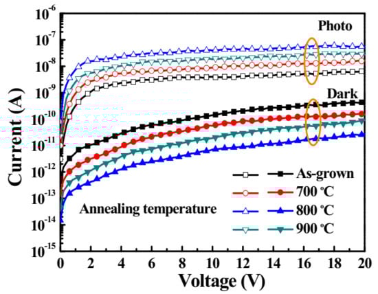 Since the wide bandgap Ga2O3 films deposited using the PE-ALD system were obtained, they were applied to MSM UVC-PDs as active layers. Figure 6 shows the dark current-voltage characteristics of the various Ga2O3-based MSM UVC-PDs. By illuminating the light with a wavelength of 250 nm and a power intensity of 10.6 µW/cm2, the photocurrent of the devices was measured and was shown in Figure 6. Compared with the as-grown Ga2O3-based MSM UVC-PDs, the dark current and photocurrent of the MSM DUV-PDs with the Ga2O3 active layer annealed at 800 °C decreased from 43.87 pA to 2.03 pA and increased from 2.77 nA to 27.45 nA, respectively, at bias voltage = 5 V. The improvement in dark current and the photocurrent was attributed to the reduction of oxygen vacancies and defects in the Ga2O3 film annealed at 800 °C. Furthermore, compared with the MSM UVC-PDs with 800 °C-annealed Ga2O3 active layer, the larger dark current of 6.01 pA of the devices with the 900 °C-annealed Ga2O3 active layer at bias voltage = 5 V was attributed to more resided oxygen vacancies and defects. Furthermore, its lower photocurrent of 13.20 nA was attributed to the degraded crystallinity of the 900 °C annealed Ga2O3 active layer compared with that of the 800 °C annealed Ga2O3 active layer.