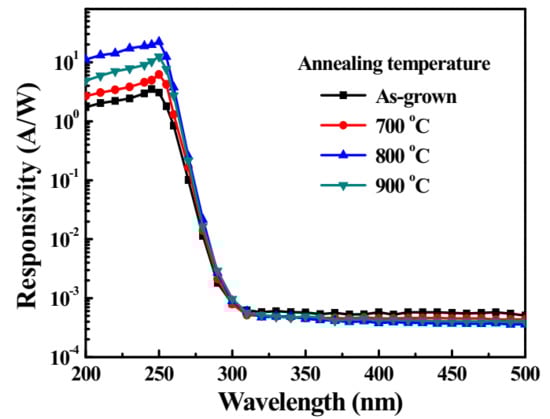 Figure 7 illustrates the photoresponsivity spectra of the various Ga2O3-based MSM UVC-PDs under a bias voltage of 5 V. The cut-off wavelength and the maximum photoresponsivity of the MSM UVC-PDs with the as-grown Ga2O3 active layer were about 245 nm and 3.51 A/W, respectively. The cut-off wavelength of the MSM UVC-PDs with the annealing-treated Ga2O3 active layers was about 250 nm. The corresponded cut-off wavelength of the various Ga2O3-based MSM UVC-PDs coincided with the associated optical bandgap energy of the used Ga2O3 active layers. The maximum photoresponsivity of the MSM UVC-PDs with the Ga2O3 active layers annealed at 700, 800, and 900 °C was 6.17, 22.19, and 12.53 A/W, respectively. Since the Ga2O3 active layers annealed at 800 °C exhibited the best crystallinity and the lowest oxygen vacancy and defect, its resulting MSM UVC-PD had the best photoresponsivity. The UV (245 nm)/visible (450 nm) rejection ratio of the photoresponsivity (Rrj) of the MSM UVC-PDs with the as-grown Ga2O3 active layers was 6.22 × 103. The UV (250 nm)/visible (450 nm) rejection ratio of the photoresponsivity was 1.37 × 104, 5.98 × 104, and 3.09 × 104 for the MSM UVC-PDs with the Ga2O3 active layers annealed at 700, 800, and 900 °C, respectively. The largest rejection ratio of the MSM UVC-PDs with the 800 °C-annealed Ga2O3 active layers was attributed to the associated lowest dark current and the largest photoresponsivity resulted from the possession of the best crystallinity and the lowest oxygen vacancy and defect.