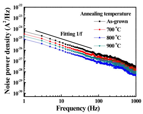 Figure 8 shows the frequency-dependent noise power density spectra of the various Ga2O3-based MSM UVC-PDs under a bias voltage of 5 V. It could be found that the fitting curve of noise power density spectra was consistent with 1/f, where f is frequency. This result demonstrated that the main low-frequency noise was flicker noise. The flicker noise is mainly affected by lattices and surface traps resided in the material. The total noise current (in) could be determined by integrating the noise power density (Sn(f)):