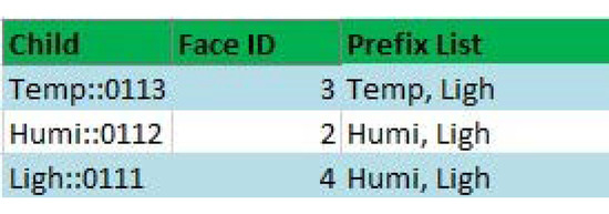 During the rank discovery process, each node builds up a table containing child nodes’ information, similarly to the RPL. However, the child table in sDCT contains the child nodes’ name, face ID, and a list of prefixes existing under the subtree of the child nodes, as shown in Figure 3. The table helps a node know which types of sensors are available under its subtree. In other words, a node knows which types of sensing data that the node or its child nodes can provide. This information is later used for semantic multicast forwarding. For example, if the edge wants to send a packet to temperature sensors, then the packet is forwarded to only subtrees that have the prefix of “Temp”. As a result, a sensing data query is forwarded to a subnetwork only if the subnetwork produces the matching type of sensing data. The design is to improve the efficiency of packet forwarding inside a WSN, thus saving energy for sensors.