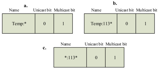 Each interest packet header in sDCT consists of the name of interest, a unicast bit, and a multicast bit, as shown in Figure 4. The name in the interest packet expresses the type of data of interest (i.e., temperature data or light data, etc.) and the level of the network of interest (i.e., in the whole network or only in a subnetwork). For example, Figure 4a illustrates an interest packet for the temperature data (i.e., temp) in the whole network level (i.e., ::*). Figure 4b illustrates an interest packet for the temperature data (i.e., temp) in the subnetwork (i.e., ::113*). Figure 4c illustrates an interest packet for any sensing data (i.e., *) produced by the subnetwork (i.e., ::113*).