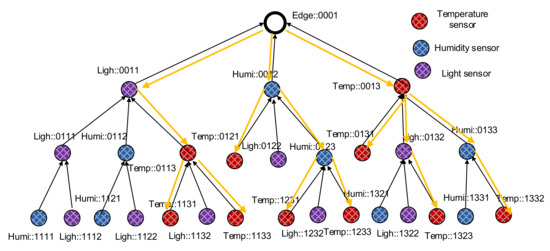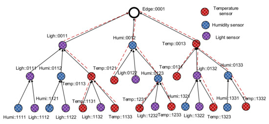 Figure 2 illustrates an example of a semantic data collection tree constructed starting from the edge node downward to child nodes. The same of each node shows its semantic information, including its type of sensor and its rank in the tree. With this semantic data collection tree design, data queries for specific types of sensing data can be facilitated.