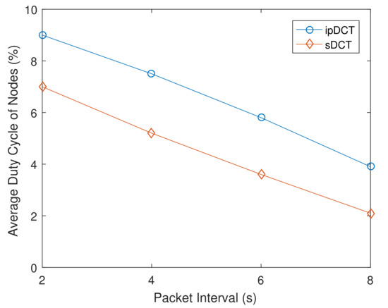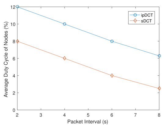 For MP2P traffic experiments, every node is required to report its sensing data to the edge in every packet interval. We vary the packet interval from 2 to 8 s. We then measure the average duty cycle of sensors in the sDCT, L2RMR, and ipDCT. The obtained results are presented in Figure 11. Figure 11 shows that the sDCT achieves the lowest average duty cycle of nodes. L2RMR achieves a significantly lower average duty cycle of nodes compared to ipDCT, but the result is higher than that of the sDCT. Their number of data messages is quite similar. However, ipDCT and L2RMR require frequent control messages to maintain the tree.