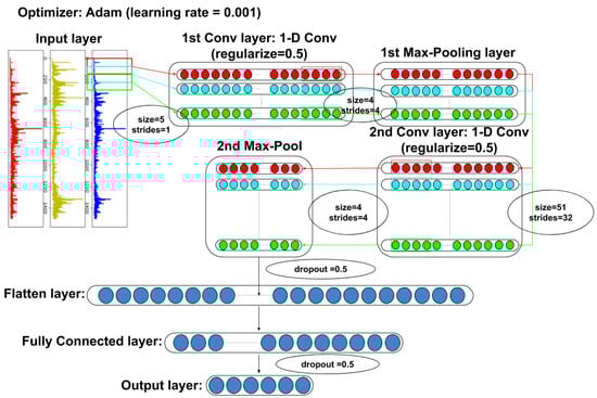 In this study, the adopted CNN architecture refers to the work of Jiao et al. [19], and modifies the size of the convolution kernel of the convolutional layer. Here, the detailed number of parameters used in CNN and the architecture of the CNN are shown in Table 1 and Figure 3: