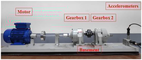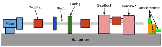 The experiment in this study uses a servo motor to drive helical gearboxes as shown in Figure 4 where three accelerometers are mounted on the basement to capture the vibration waveform of the gearbox. The material of the basement is aluminum and the size is about 1000 mm × 200 mm × 25 mm. In addition, the structure of the gearbox is shown in Figure 5. Here, the system development is based on Python 3.7.6, and Tensorflow 2.1 is used to construct CNN. The CPU of the computer used for network training is i7-8700, memory is 24 GB, and GPU is NVIDIA RTX 2060 (6 GB). The sampling frequency of the vibration signal is 10 kHz and the time span of sampling is 1 s. The captured signals are then fed into CNN model for classification of faults.