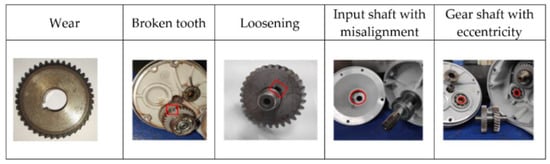 In this study, five types of gearboxes with different faults were produced by hand-made processing, including wear, broken teeth, loosening, misalignment of the input shaft, and eccentricity of the gear shaft, as shown in Figure 6.