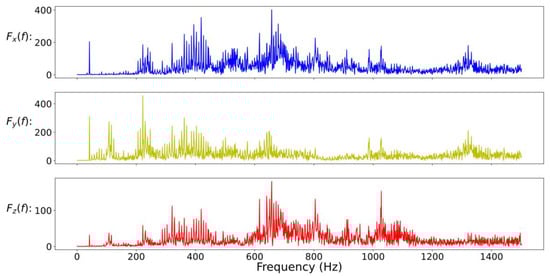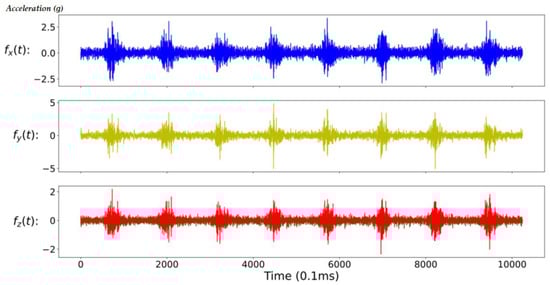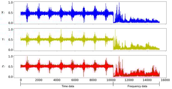 In general, the characteristics of the fault may appear in the time domain or the frequency domain. In this study, in addition to the time-domain and the frequency-domain data as the training input data of the CNN model, the time-domain and frequency-domain data are also combined as the new training input data. Due to the large difference in amplitude between time-domain data and frequency-domain data, it will be normalized before splicing. In addition, in mechanical applications, high-frequency data is often filtered out because it is considered to contain a lot of noise. Therefore, this study also compares the results of filtered and unfiltered data; so, here will cover five data formats, namely full-time (FT) data (as shown in Figure 8), low-frequency (LF) data (as shown in Figure 9), full-frequency (FF) data (as shown in Figure 10), full-time combining low-frequency (FTCLF) data with normalization (as shown in Figure 11), and full-time combining full-frequency (FTCFF) data with normalization (as shown in Figure 12). Here, the waveforms in Figure 8, Figure 9, Figure 10, Figure 11 and Figure 12 were captured under the condition of wear with broken-tooth.