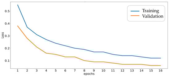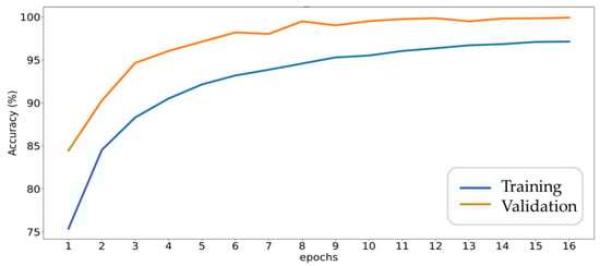 As described in Section 3.1, 30% of data records are reserved for test or validation which are not used in model training. The overall accuracy and loss trends with each epoch for training set and cross-validation set are shown in Figure 14 and Figure 15, respectively, where FF data are used as input and 240 neurons are adopted in fully connected layer. From Figure 14, it can be seen that the accuracy of the training set gradually increases with successive training, while the accuracy of the cross-validation set follows the trend and eventually approaches 100%. Furthermore, from Figure 14, the accuracy gap between the two curves is related to the dropout mechanism. Here, due to the software configuration of library, the dropout enabled in the training process would reduce the accuracy. On the contrary, the dropout is turned off in the validation process. Another reason for the gap is the fault signals of gearboxes are not diverse enough due to limited fault samples.