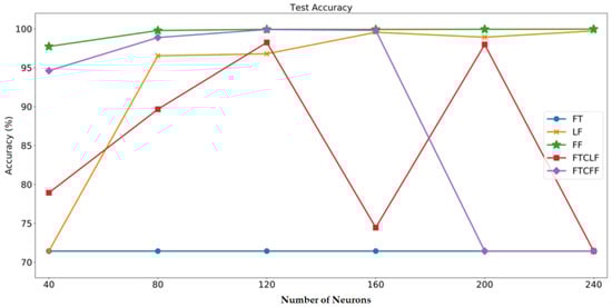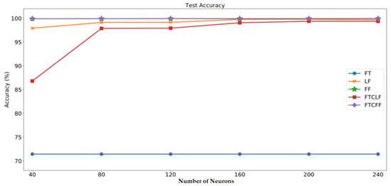 Comparing Figure 16 and Figure 17, it can be seen that the overall performance in revised CNN has been significantly improved. It is due to the chance of each variable of the revised model being trapped in the local minimum during training is reduced. Except for the case of FT data type, when the number of neurons in the fully connected layer is 80 or more, the diagnostic accuracy rate of each model can reach more than 95% where the accuracy of FF or FTCFF cases is almost 100%.