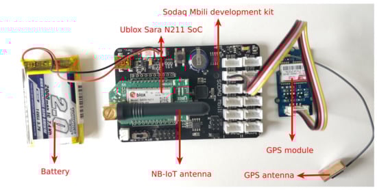 All NB-IoT messages are collected by sending uplink messages from a Ublox Sara N211 System on Chip (SoC) over a Release 13 NB-IoT network to a backend. Each message contains the Cell ID of and the RSS value to the responding eNB. By connecting a Global Positioning System (GPS) module to the UE, the current location (i.e., latitude, longitude, altitude) is added to the message. The GPS coordinate is used as a ground truth reference location. Therefore, in the following, we define the location estimation error as the geographical distance from the estimated location to the location provided by the GPS receiver. A picture of the battery-equipped UE with GPS is shown in Figure 1.
