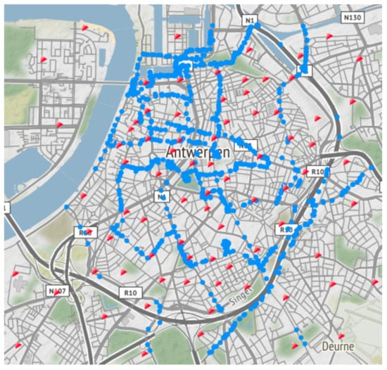 Since we collected a large outdoor publicly available Sigfox and LoRaWAN data set in the city of Antwerp [], we decided to perform the NB-IoT measurements in the same environment. In this way, we are able to compare the localization performance of the three most popular LPWAN technologies available on the market. The heterogeneous zone of interest covers an area of 53 and is fully covered by a public NB-IoT Release 13 network, consisting of 83 eNBs. During the measurement campaign, we collected 1307 NB-IoT messages within the predefined zone, as shown in Figure 2.