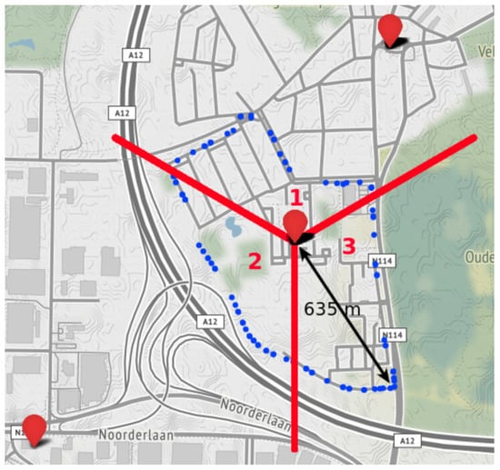 Map of the measurement campaign around a single eNB with three cell sectors, used to study the mobility. The 95 blue circles represent the GPS locations of each uplink transmission. The sector boundaries of each cell of the eNB are shown in red.
