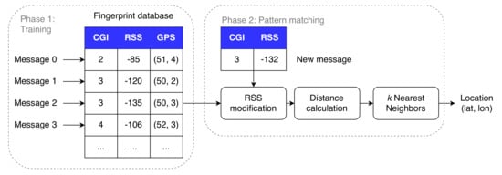 As in many ML-based approaches, the localization data set described in Section 3 is split into 70% training messages, 15% test messages and 15% validation messages. The actual fingerprinting technique is split into two phases, as visualized in Figure 5. The first and offline phase consists of collecting training messages into a fingerprint database. Each entry of the fingerprint database consists of the RSS value to the serving eNB, together with the Cell Global Identity (CGI) and GPS coordinate of the ground-truth location. Consequently, in the second and online phase, a test fingerprint is being matched to the earlier collected fingerprints, stored in the training database. Using the kNN algorithm, we calculate the distance between the test sample and each training sample in signal space. Afterwards, the location of the UE is estimated by computing the centroid of the ground truth locations of the k nearest neighbors. Additionally, we optimize several kNN-based algorithms in this work. In brief, we iterate over four different RSS representations, 31 distance metrics and several values of k, similar to what we did in []. After the most optimal parameter configuration is found, we validate our results using the messages in the validation data set.