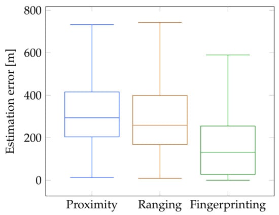 The location estimation errors from the test data set are validated by running the algorithm with the optimal parameter set again with unseen data from the validation data set. This yields a mean and median location estimation error of 204 and 132 , respectively. Moreover, 95% of all measurements result in a localization error under 679 . The location estimation errors for the outdoor proximity, ranging and fingerprinting algorithms are summarized in Figure 6.
