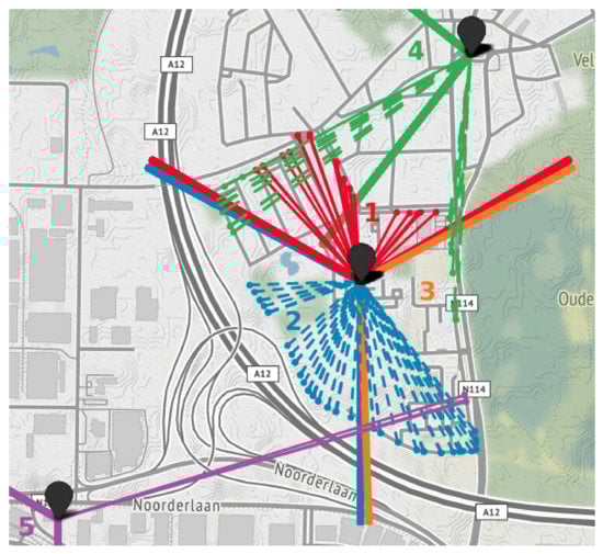 Figure 7 visualizes the connections between every transmission location and the currently serving cell, as well as the respective cell sector boundaries. Starting at the north side and moving counterclockwise, the first UE positions (i.e., red dots) are located within sector 1, which is the sector of the serving cell. When the UE moves outside sector 1, the cell reselection takes place and in most cases the adjacent cell corresponding to sector 2 becomes the serving cell. After leaving sector 2, the UE remains connected to the cell related to sector 2 and never connects to the cell covering the area of sector 3. Instead, we observe serving cells from other eNBs for short amounts of time (i.e., cell sectors 4 and 5). Thus, only two out of three cells of the center eNB are used.