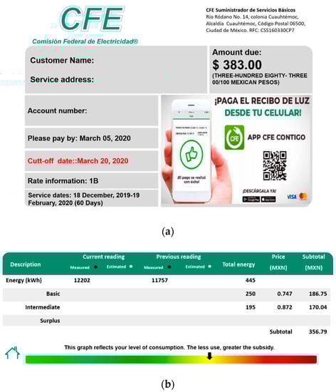 - CFE. Available online: https://www.cfe.mx/Casa/InformacionCliente/Pages/Conoce-tu-recibo.aspx (accessed on 31 August 2020).