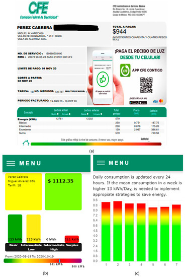 The way to design the interface of the real-time bill was to review the information given by the CFE and how the user can use it efficiently. The images given in Figure 2 summarize the most relevant information for the user [27] (which corresponds to the translated version).