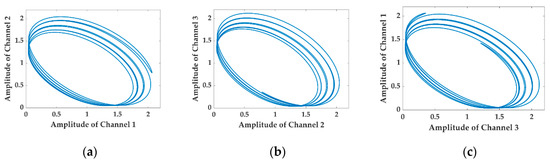 Numerical results obtained from Equation (1), in which the auxiliary amplitude modulation (AAM) of the light source is neglected: standard ellipses. (a) The Lissajous figure (LF) drawn with Channel 1 and Channel 2; (b) the LF drawn with Channel 2 and Channel 3; (c) the LF drawn with Channel 3 and Channel 1.