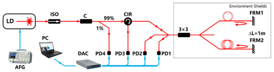 In order to research the influence of the AAM experimentally and validate the solution proposed, an experimental setup is constructed as is illustrated in Figure 3. The light source is a diode laser (LD, Orion™ series, RIO) centered at 1550 nm, providing an output power of 10 mW, followed by an optical fiber isolator (ISO) to avoid the influence of the echo. A sinusoidal modulation signal is generated by an arbitrary waveform generator (AWG) which is conducted on the light source to implement the FM. The label C represents a 1:99 2 × 2 coupler—the output of the laser is acquired by the 1% beam and achieved by PD4, which possesses a low circuit noise. The role of the circulator (CIR) is to make the third interferometric signal able to be detected by PD3 without hindering the transmission of the input light. The two arms at the opposite side of the 3 × 3 coupler, which own a difference in the length, constitute an unbalanced Michelson interferometer. The Faraday rotator mirror (FRM) eliminates the influence of the polarization fade by making the polarization change of the reflected light precisely counteract that of the incident light [17]. The unbalanced Michelson interferometer together with the frequency modulated laser contributes to the realization of the IM method. Besides Channel 3, the other two channels of the interferometric signals are detected by another two low noise photodetectors which are named by PD1 and PD2, respectively, and processed by a personal computer (PC) after being acquired from a digital acquisition card (DAC). The 3 × 3 coupler together with the arms of the interferometer is placed in an environment shield to cut off the external disturbance. To be noted, the length difference between the two arms of the Michelson interferometer in the experiment is 1 m, and the corresponding optical path difference (OPD) is 2.912 m considering that the light experiences a round-trip transmission in each arm. Considering that the laser output is acquired via the 1% branch of the 1:99 coupler, the gain of the PD4 is set to be 10 times higher than other three in order to prevent the background circuit noise level of the PD4 from being comparable to electrical signal amplitude converted from the acquired light, which can lead to the thickening of the LFs due to the noise-induced random fluctuation.