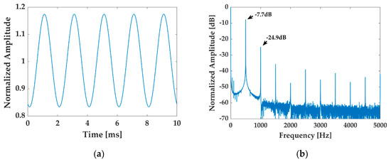 The modulation frequency of the FM being set as and the depth as , the three interferometric signals from the 3 × 3 coupler are acquired on basis of the experimental setup, so is the output of the laser. The normalized results of the laser output are shown in Figure 4, in which all the data are divided by the zero-frequency value to make the distinction between the DC and the AC more intuitive. The Figure 4a shows the normalized time-domain wave diagram of the frequency-modulated laser output, indicating that the amplitude of the output is modulated by the AAM, while the frequency component of and its higher harmonics are observed in the logarithmic frequency spectrum of the laser output, as is shown in Figure 4b. Additional attention should be paid on the amplitudes at the frequency and , which are only 7.7 dB and 24.9 dB lower than the DC component, respectively, revealing that the AAM is so drastic that can have a non-negligible influence on the calibration.