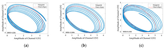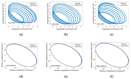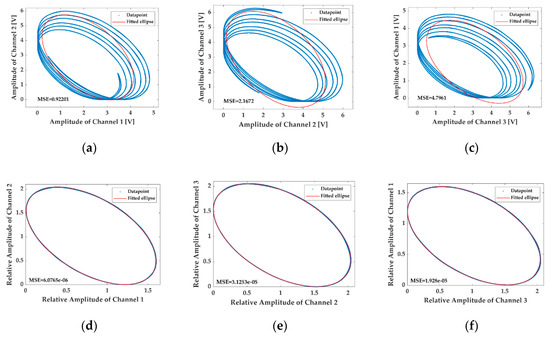 The feasibility of the proposed solution in eliminating the influence of the AAM on the calibration of the 3 × 3 coupler asymmetric parameters is verified experimentally. In the experiment, the three channels of the interferometric signals acquired from PD1, PD2 and PD3 are all divided by the output of the light source achieved from PD4. As a result, another three interferometric signals are generated, which possess the form of the signals in Equation (5) without any correlations with the AAM according to the theory section. Three pieces of LFs are drawn with the processed interferometric signals to validate the practical performance of the handling method, which are displayed in Figure 6. It is manifested that shapes of the LFs are close to ellipses after the interferometric signals are divided by the acquired output of the laser, which can be fitted well with the standard ellipses as the MSEs of the fitting results are about , and , respectively, which are all almost five orders of magnitude lower than the mean value of the processed interferometric signals (), indicating that the influence of the AAM is nearly wiped out and the precision of the calibration can reach a high level.