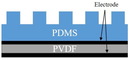 In order to manufacture the simplest type of sensor, the sensor was manufactured with only minimal elements. A piezoelectric film was used to measure the vibration generated on the sensor surface. The piezoelectric film used at the sensor is a polyvinylidene fluoride (PVDF) material. PVDF can be shaped into various sizes and is inexpensive []. It is also a flexible material and is suitable for the material of tactile skin. Electrodes are formed on both sides of PVDF to transmit piezoelectric signals. In this paper, a metalized piezo film sheet (2-1004347-0, Measurement Specialties, Hampton, VA, USA) was used. This film has a 52 μm-thick PVDF layer polarized in the direction of thickness and has electrodes formed on both sides of each 6 μm-thick silver ink. The piezo film cut according to the size of the sensor was wired using copper tape. The fabricated PDMS fingerprint structure was attached to the PVDF film. The PDMS structure protects the exposed electrodes and amplifies vibrations caused by slip. As a result, a very simple structure of the slip sensor was manufactured.