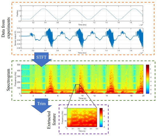 Appropriate feature extraction is critical to design a neural network with given data []. Frequency-domain data and time-domain data are meaningful information that can be obtained from a one-dimensional vibration signal. A spectrogram can be used to use both frequency domain and time domain data. Spectrograms have been used for speech recognition from long ago to recent day [,]. Since voice recognition uses vibration data of sound, it has similarities to slip detection using vibrotactile data. One of the slip detection sensors developed in the early days used a spectrogram []. However, as more recent slip detection sensors use arrays, the use of spectrograms has decreased. Nevertheless, the spectrogram has many useful points when analyzing vibration signals. The most significant advantage is converting 1D data into meaningful 2D data. Neural networks such as CNN can recognize the relationship between adjacent data. When using such neural networks, using more than 2D data gives a significant advantage in performance.