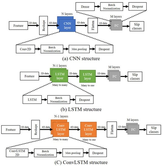 CNN uses 3D data, a set of 2D images, as input. Another dimension with a value of 1 was added to input a feature that is 2D data. Through this, a feature matrix with a size of 50 × 150 becomes a matrix with a size of 50 × 150 × 1. After that, it passes through the CNN layers composed of N layers. Each CNN layer is composed of Conv2D (3 × 3 filter window size), batch normalization, max pooling, and dropout layers (see Figure 4a). Data passed through the CNN layers are converted into a one-dimensional vector to input the FC layer. Each of the M FC layers is composed of dense, batch normalization, and dropout layers (see Figure 4a). N and M and the number of units of each layer were determined through grid search. At the last FC layer, binary classification is performed to determine whether or not to slip.