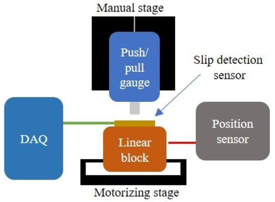 First, to optimize the artificial neural network, an experiment was performed by attaching a slip sensor to a flat surface. The sensor attached to the plane generates slip through slip test equipment as Figure 5. The sensor and the flat surface are fixed to the motorizing stage, moving left and right. A vertical manual stage was used to press the object against the sensor surface with a constant force. With a constant force applied to the sensor, the motorizing stage is driven to generate a forced slip on the sensor surface. This simulates slip occurrence due to external factors when the robot grips an object with a constant force. The signal generated at this time is collected through DAQ. Moreover, the position of the motorizing stage is collected through a position sensor. The signal collected from the position sensor is used to generate a label to determine whether it is slipping.