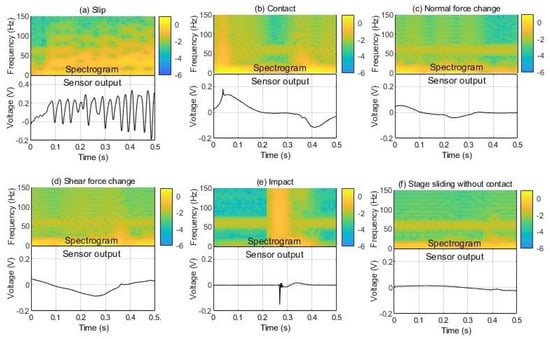 Slip refers to the change in relative position between the sensor and the mating surface in contact. When a slip occurs, the contact between the sensor and the mating surface changes, and it makes the magnitude of the frictional force change. This phenomenon is called a stick-slip phenomenon []. A change in frictional force causes vibration on the entire sensor. The vibration pattern of a stick-slip phenomenon has characteristics distinguished from disturbances, such as the vibration of a motor. Therefore, the sensor can detect slip by analyzing the surface vibration [].