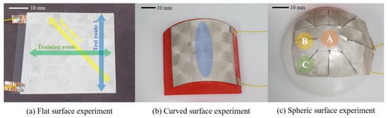 A curved surface experiment found that the sensor operates on the same principle for curved surfaces with different curvatures. The sensor was attached to the spheric surface to see if the same principle applies to further worse conditions. Attachment to the spheric surface is to check whether the sensor can be used after cutting and attaching a part of the sensor to any surface. If the sensor has sufficient accuracy for a spheric surface, it can be applied to any surface. The training data were prepared for surfaces of 50, 30, and 20 mm curvature. The slip was generated at three points for each spheric surface to check whether the slip was well sensed for the cut part. In Figure 7c, Area A is the central part of the spheric surface and is the part that is minimally affected by the cut. Area B is the portion of the cut that is side to the center. Area C is where the cut was made in the diagonal direction, the most cut was made, and the part that was farthest from the center. The spheric surface was placed on the slope to generate slip at these points, as Figure 10c.