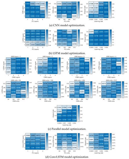 Among the four ANN models, the optimization process of the CNN-LSTM parallel model is as Figure 8c. The parallel model consists of a CNN layer and an LSMT layer connected in parallel, and an FC layer. The grid search was performed with different numbers of hidden layers for these three structures. The accuracy was compared for a total of 64 models with a different number of the hidden layer. CNN, LSTM, and FC have four different sizes of hidden layers, from 1 hidden layer to 4 hidden layers, respectively. In consideration of the influence on the random initial value, ten training was performed, and each model was compared using the accuracy of the average value. As a result, a model with the LSTM 3 layer, CNN 4 layer, and FC 2 layer showed the highest accuracy. The same process was applied to the number of units in the hidden layer. Furthermore, 64, 128, 256, and 512 units were selected as the number of units. Accuracy was compared for 64 models created through this process. As a result, the model using 64 units of LSTM, 512 of filters with CNN, and 128 units of FC showed the highest accuracy. Moreover, the grid search was performed for the dropout rate and learning rate. Dropout rate was used for 4 values of 0.5, 0.6, 0.7, 0.8, and learning rate was used for 4 values of 0.0005, 0.001, 0.002, and 0.004. The best results were obtained when the dropout rate was 0.5, and the learning rate was 0.0005. As a result, the structure of the optimized CNN-LSTM parallel model appeared as shown in the Figure 9. The same process was carried out for the remaining 3 ANNs, and the results are shown in Table 2.