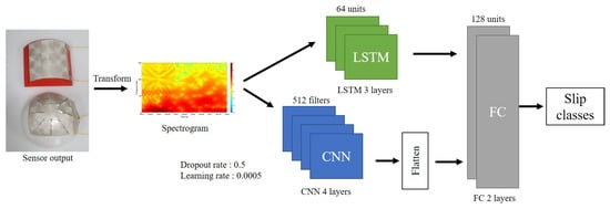 The vibration signal from the sensor was converted into a spectrogram and used as an input to a neural network. Four neural network models were used to compare the slip detection performance in various ANNs. The used models are CNN, LSTM, CNN-LSTM parallel model, and ConvLSTM model. In order to derive the maximum performance of each neural network, optimization was performed for each model. The number of hidden layers, the number of units, the dropout rate, and the learning rate were selected as optimization parameters. In the selected parameter, the optimal value was found using a grid search.