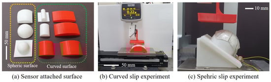 Through the optimization process, four ANN models to be used for slip detection were prepared. The next experiment was conducted by attaching a sensor to a curved surface to compare slip detection performance among each model. Sensors were attached to six different curved surfaces to check whether the sensor can work well on various curved surfaces. The radius curvature of each surface is 200, 100, 50, 30, 20, 10 mm as Figure 10a. Slip occurred in blue area in Figure 7b. The configuration of the training set and the test set is the same as that of the flat surface. The testbed where the experiment was performed is the same as the previous experiment. However, the sensor was attached to the curved surface, as shown in Figure 10b. A tip was manufactured in a form similar to a stamp to generate slip on the curved surface. This tip applies a constant force to the sensor continuously while slip occurs.