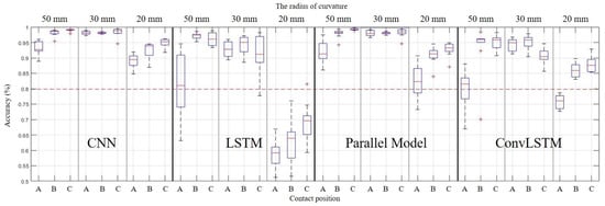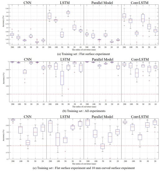 First, training was performed using only the slip data on a flat surface, and then the slip data for each of the six curved surfaces was classified. Initialization and training were performed for each of the four models ten times, and accuracy was compared. The accuracy of 6 curved surfaces for four models is shown as a box graph in Figure 11a. The top of the box in the box graph is the top 75%. The bottom of the box is the bottom 25%. The middle red line is the median value, the upper part of the beard is the maximum value, and the lower part is the minimum value. The red crosshair separated from the box is an outlier. In general, it can be seen that the smaller the curvature, the lower the accuracy. The CNN and the CNN-LSTM parallel model showed an accuracy of less than 70% for all six surfaces. This learning state cannot be used because of poor accuracy in binary classification. LSTM and ConvLSTM show slightly higher accuracy than the CNN and the parallel model. The curved surface with a curvature of 200 mm shows moderate accuracy. However, the average accuracy is still low, and when the curvature is low, the accuracy is less than 70%. The average accuracy of CNN is 56.4%, LSTM is 75.6%, parallel model is 57.1%, and ConvLSTM is 73.9%. When these results are put together, using neural networks trained with flat surface data shows insufficient accuracy.