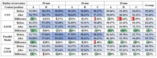 As a result, there was much improvement in accuracy for the central area as Figure 13. In particular, an apparent increase in accuracy has occurred in the LSTM model, which showed high accuracy with little data. However, in the CNN model that requires many data for high accuracy, the overall accuracy decreases. This problem occurred because data on the side and diagonal parts were not in the transfer learning data. The CNN-LSTM parallel model overcomes these shortcomings of CNN. Due to the influence of the LSTM included in the parallel model, it was possible to improve the accuracy of the center part considerably, while also increasing the accuracy of the rest part. Through this, the CNN model showed the best overall accuracy before transfer learning, but the CNN-LSTM parallel model showed the highest overall accuracy after transfer learning.